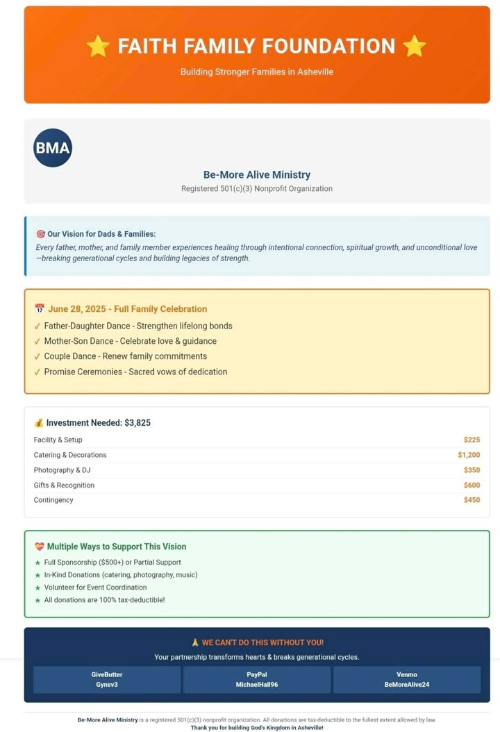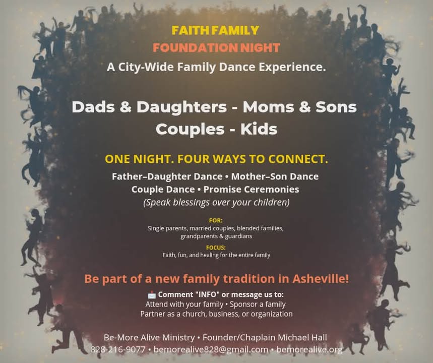 Dear Pastor and Church Leadership, My name is Michael Hall, and I serve as the founder and Chaplain Be‑More Alive Ministry here in Asheville, a Christ‑centered men’s discipleship and development ministry. The heart of this work is to walk with men—especially those navigating hardship or major life transition—into a deeper, more alive relationship with Jesus that transforms how they lead, love, and serve in their homes and communities. Out of that same burden for men and families, Be‑More Alive Ministry is hosting the Faith Family Foundation Event in February 2026. This will be a one‑evening, faith‑based celebration designed to strengthen families across Asheville through a Father–Daughter Dance, Mother–Son Dance, Couple Dance, and special Promise Ceremonies where parents speak blessings and commitments over their children.